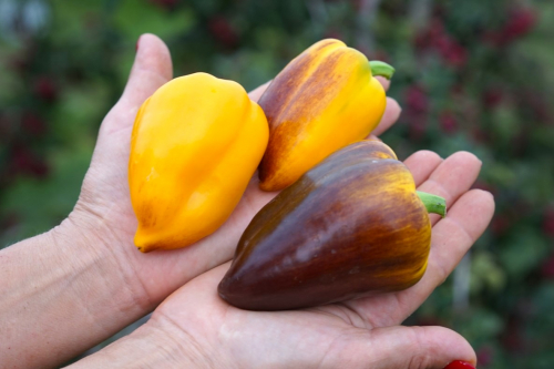 Высота  30-45 см. Среднеранний (95-105 дней). Перцы конусовидной формы. Масса 200-300 грамм. Плоды оригинальной окраски — в технической спелости ярко-желтые с темно-фиолетовыми штрихами, в биологической — приобретают насыщенную оранжевую окраску с темно-красными и фиолетовыми штрихами. Перец толстостенный, толщина стенки до 7-8 мм. Мякоть стенки плотная, блестящая, мясистая.