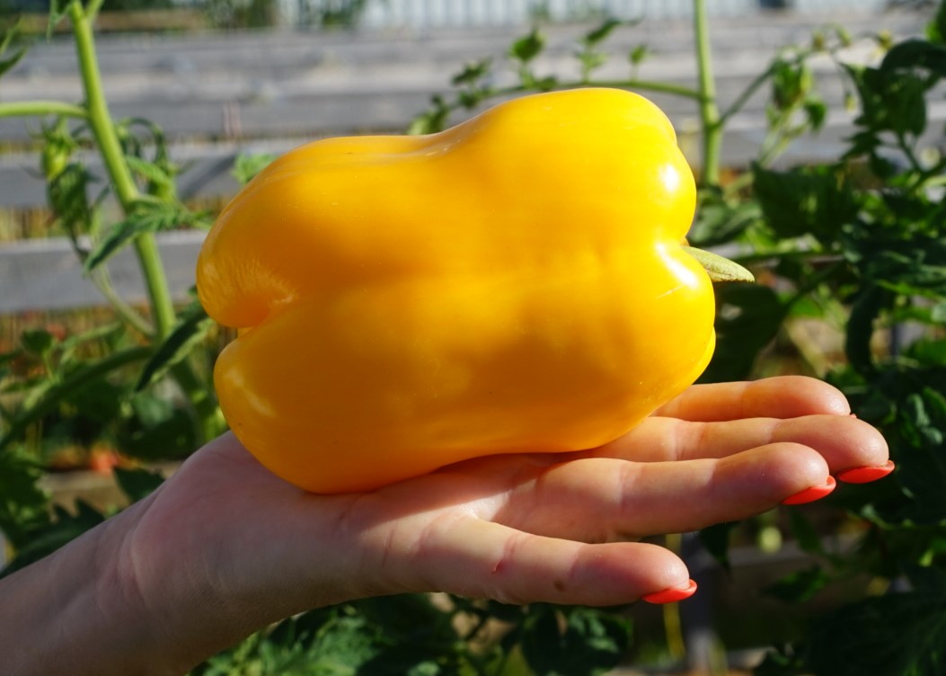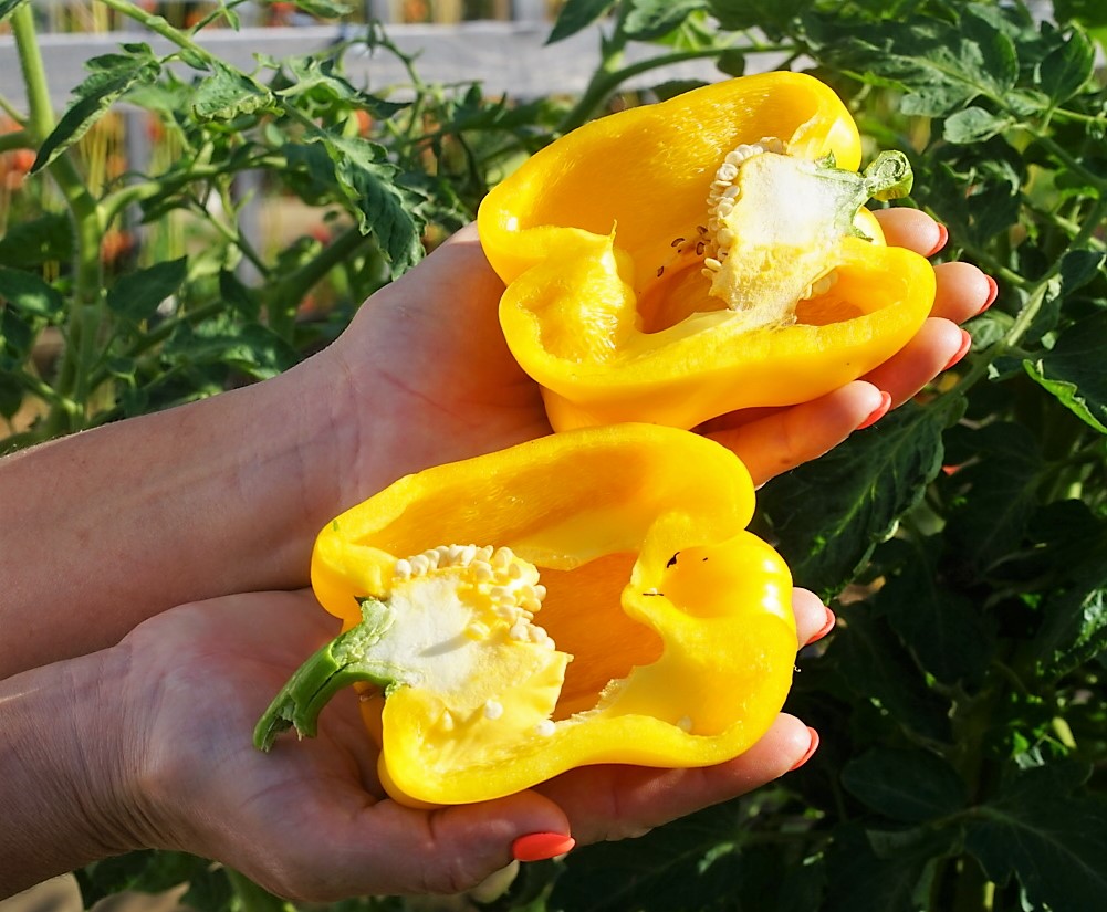 Высота 45-50. Среднеспелый. Перцы кубовидной формы. Масса — 200-270 г. В технической спелости темно-зеленые, в биологической — интенсивно-желтые. Плоды глянцевые, блестящие, толстостенные (до 8-9 мм), Сбалансированное содержание кислот и сахаров. Отличный вкус.