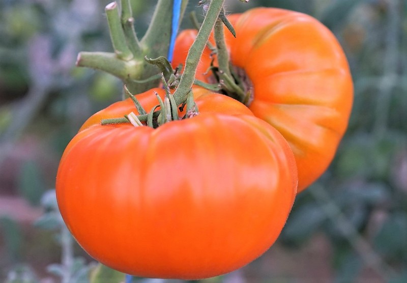 Среднеранний индетерминантный сорт. Высота в теплице до 200 см. Помидоры плоскокруглой пышной формы. Плоды ярко-абрикосового цвета.  Масса до 500 грамм. В жаркий сезон 2021, куст выдал несколько плодов до 1000 гр. Мякоть плотная, цвета манго. Насыщенный сладкий вкус с фруктовыми нотками,  немного приятной кислинки.
