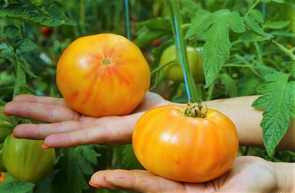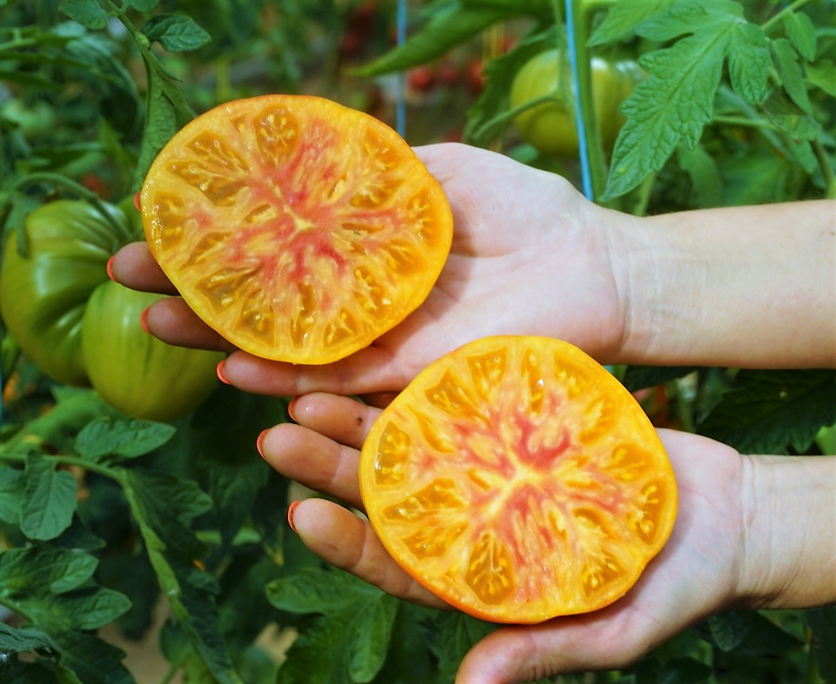 Индет. Среднеспелый. Высокорослый, до 2,0 метров. Плоды  плоскоокруглые. Масса 300-600 грамм. Цвет: золотисто-желтые с розовыми пятнами. На разрезе — смесь желтых, розовых, красных и зеленых пятен. Вкус исключительно сладкий, аромат фруктовый. Урожайность очень высокая. Сорт преимущественно салатного назначения.