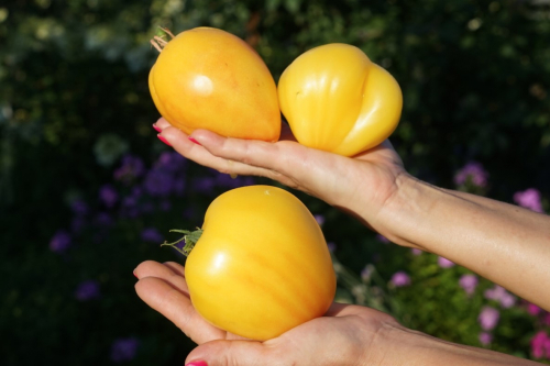 Индет, более 2.0 м. Среднеспелый. Плоды в виде сердца. Масса 200-500 грамм. Цвет: плоды бледно-лимонные, почти белые. Разрез бледно-лимонный с бледно малиновыми язычками. Мякоть плотная, сочная. Вкус замечательный, сладкий.