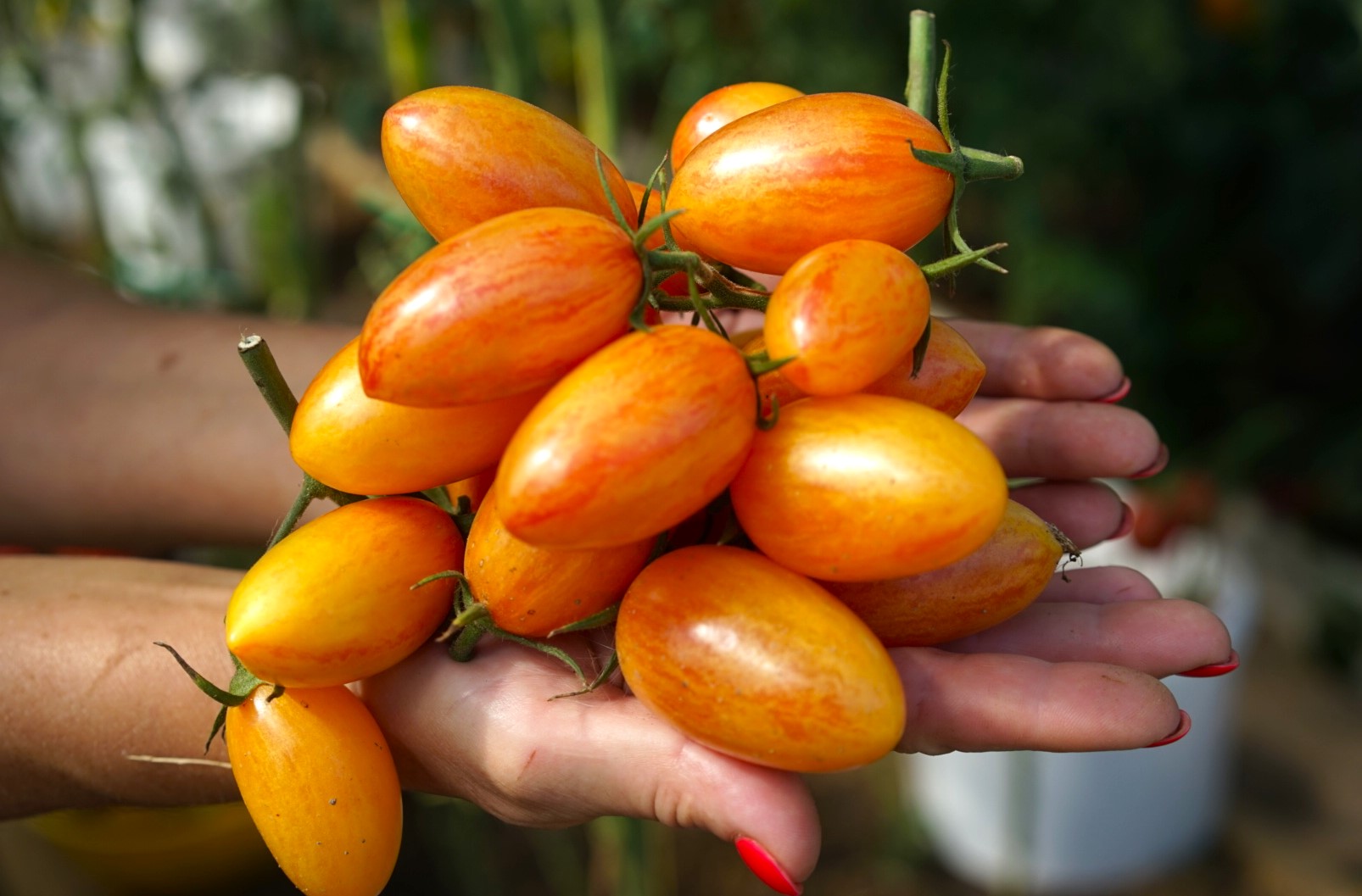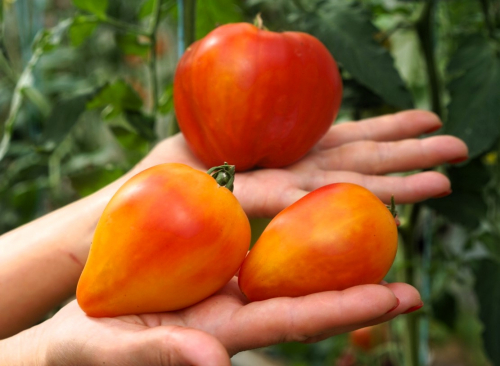 Индет, до 2,0 м. Помидоры удлиненной формы с острым носиком. Масса 40-50 грамм. Цвет — на желтом фоне розовые и красноватые полосы. Мякоть двухцветная, нежного вкуса с преобладанием сладости.