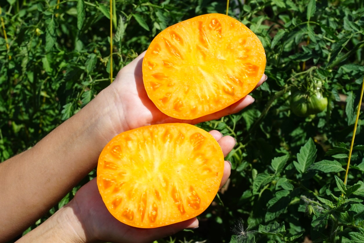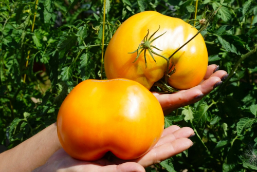Индет, до 1,8 м. Среднеспелый. Прежде всего – томат необыкновенной красоты. И хорошего размера. Плоды сердцевидной формы. Ровные и пышные. Масса плодов на нижних кистях 350-500 грамм и более. На верхних — до 500 грамм. Цвет ярко-жёлтый. В полной спелости — с небольшим розовым румянцем.  Мякоть плотная, малосемянная, очень сладкая. Назначение салатное, для экзотических соков.