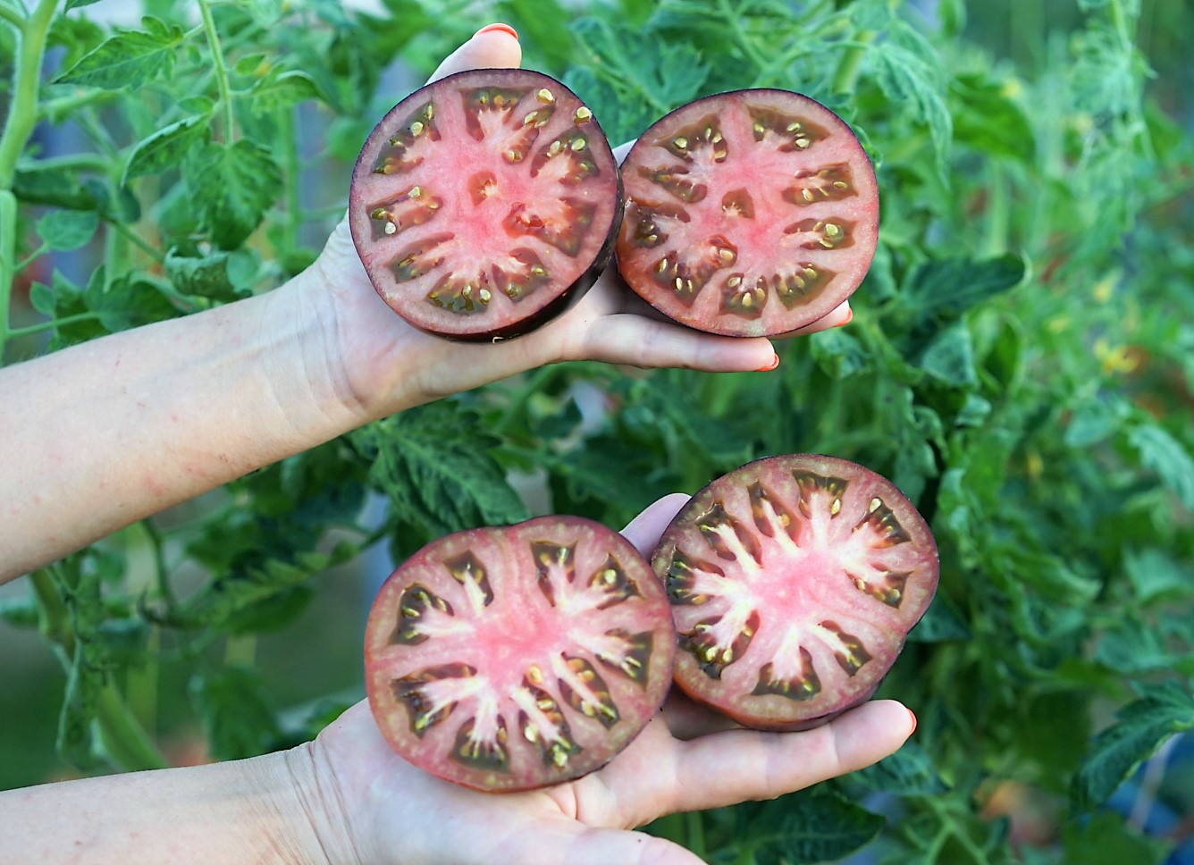 Цвет тёмно-красный с чёрными антоциановыми плечами. Большинство плодов снаружи черные полностью. Антоцианы проявляется во время формирования завязи, даже если кусты растут в небольшом затенении. Помидоры плотные, мясистые, трещиноустойчивые. Мякоть темно-красно-малиновая. Хороший вкус со сладостью и нежной кислинкой.
