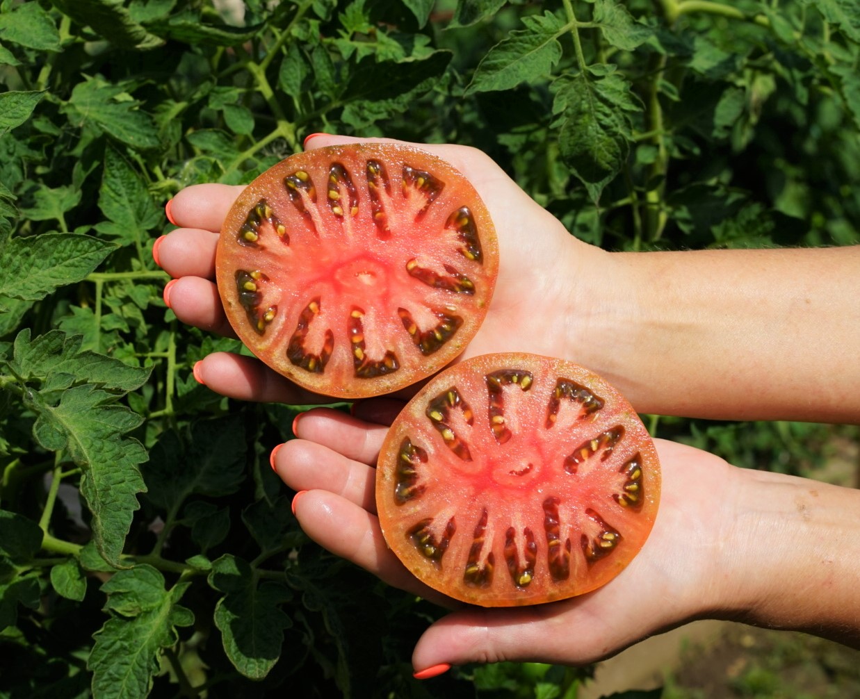 Индет. Среднеранний. Высота в теплице до 180 см. Куст крепкий, можно выращивать в два стебля. В кистях до 5 завязей. Помидоры плоскоокруглой формы. Масса 250-400 грамм. Цвет шоколадно-красный, на разрезе коричнево-красный. Мякоть малосемянная, плотная, мясистая. Вкус умеренно сладкий, с пряными нотками.