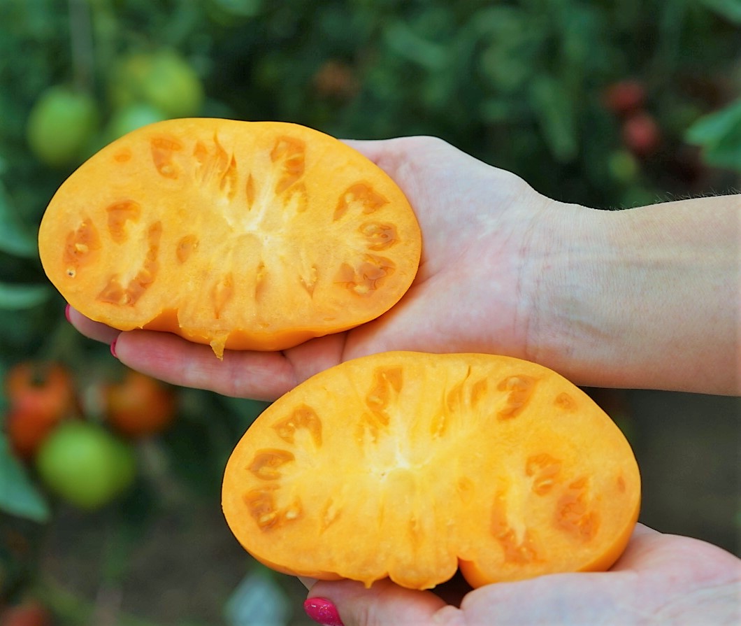 Индет, до 1,8 м. Среднеспелый. Помидоры округлые и плоскокруглые, ровные и гладкие. Цвет ярко-желтый. Масса 300-500 грамм и более. Малосемянные, мясистые, мякоть по цвету и плотности напоминает манго. На вкус идеально сладкие.
