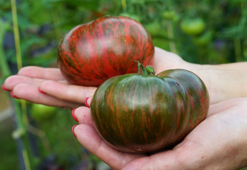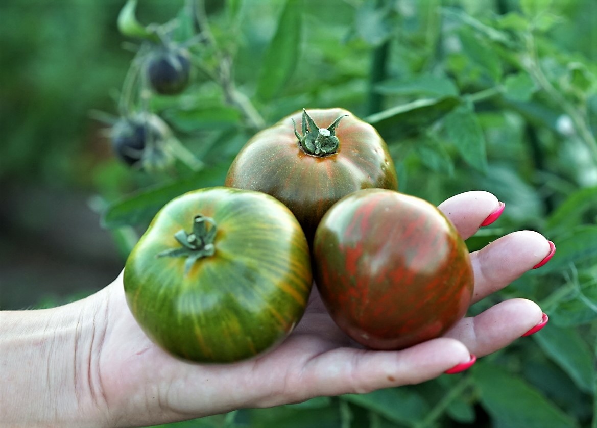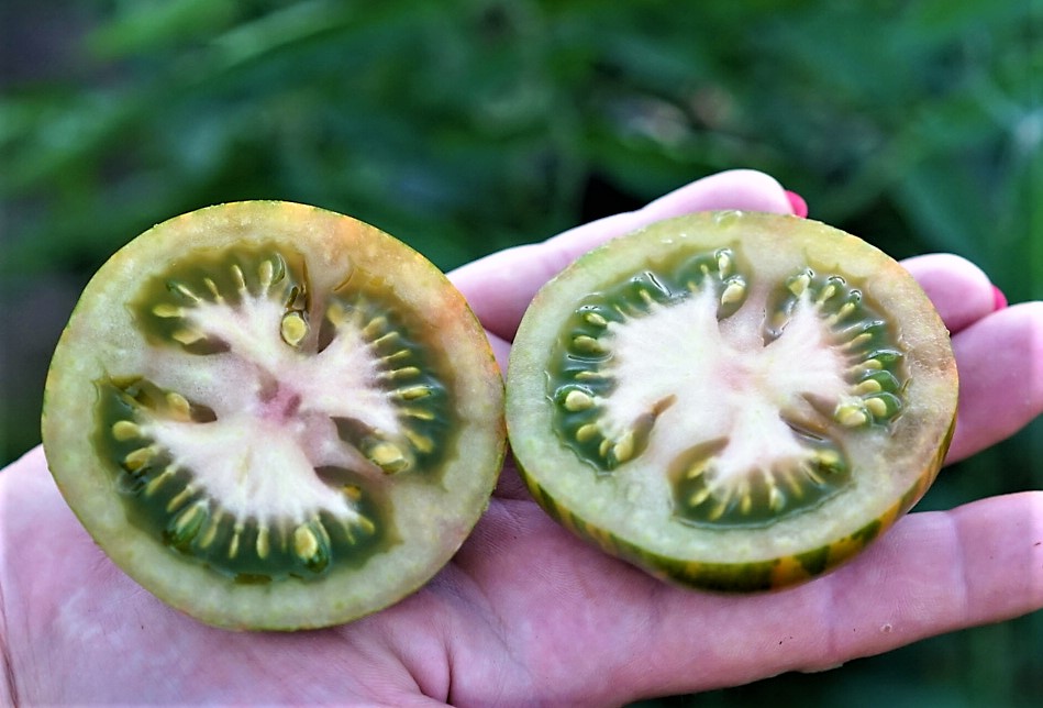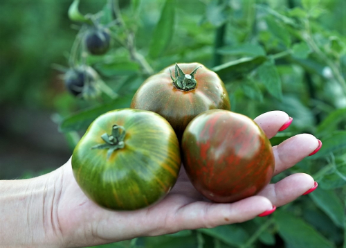Штамб. Среднеспелый. В теплице до 1 м. Масса 150-200 грамм. Цвет шоколадно-терракотовый,  с зелеными полосками. На разрезе тоже шоколадные, семена в зеленом геле. Замечательный вкус с пряной сладостью. Универсальное назначение.