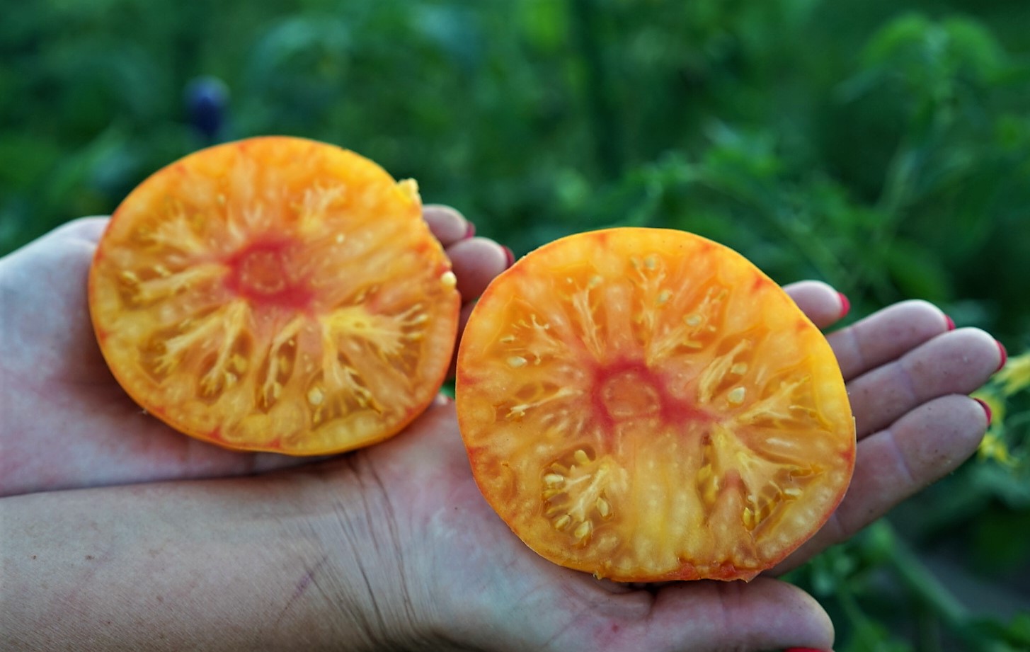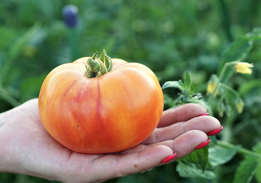 Индет. Штамб. Среднеспелый. До 1,2 м в теплице. Помидоры плоскоокруглой формы. Цвет желтый с красным румянцем. Масса 150-250 грамм, отдельные плоды до 300 грамм. Вкус сбалансированный. Мякоть плотная, сочная.