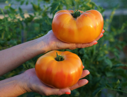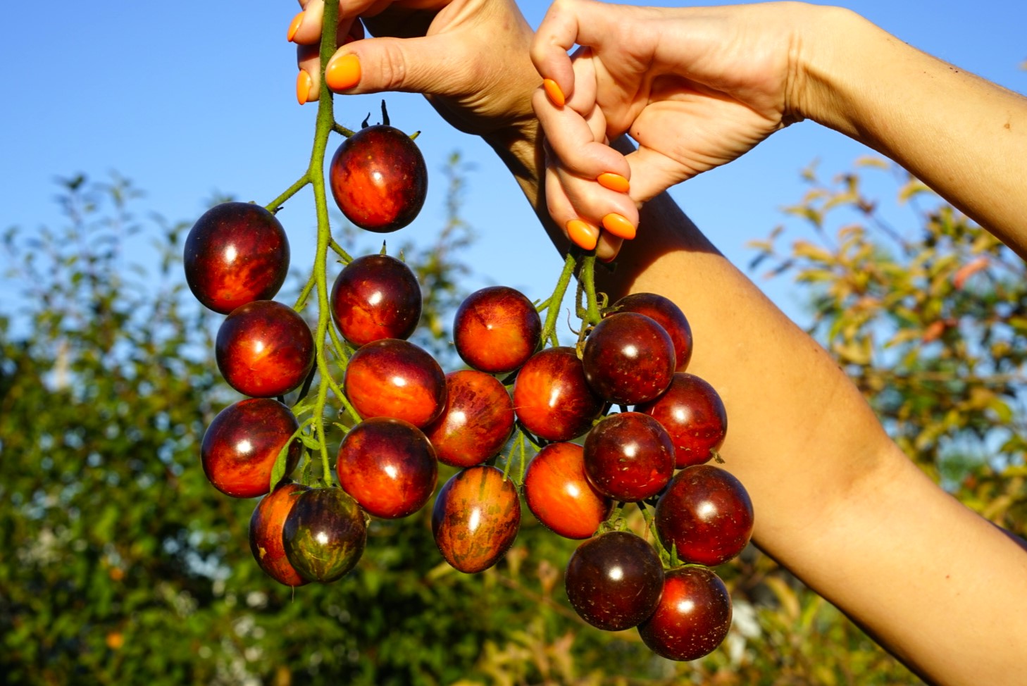 Индет, до 1,8 м. Среднеранний. Помидоры овальные со сбегом к макушке, некоторые с маленьким носиком. Масса 30-50 грамм. Цвет: ярко-оранжевые, плечики фиолетовые, темные полоски и пятна. Нежный вкус со сладостью.
