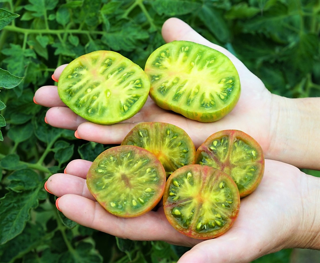 Высота в теплице до 1,2 м., в открытом грунте  0,8-1,0 м. Среднеспелый. Форма плодов  округлая. Масса 60-80 грамм. Окраска зрелых плодов экзотическая – на золотисто-оливково-зеленом фоне расположены оранжевые, красно-коричневые штрихи и полосы. Незрелые плоды светло-зеленые, с более тёмными полосами. Окраска мякоти оливково-зеленая с красно-коричневым рисунком, в сердцевине малиново-розовый «галстук».  Чем больше солнца и тепла —  тем богаче разнообразие красных оттенков и ярче томаты. Вкус насыщенный, фруктово-сладкий.  Назначение универсальное.