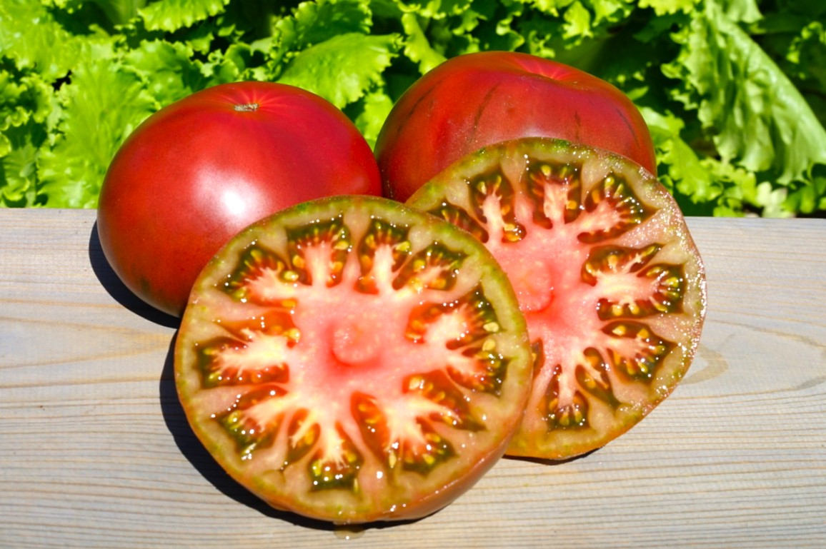 Среднеспелый. Высота от 0,7 м. до 1,6 м. в зависимости от условий выращивания. Форма плоскоокруглая, с пышными плечиками. Масса 150-300 грамм, отдельные томаты до 400 грамм. Цвет плода пурпурно-бордовый снаружи, мякоть розово-вишневая, плотная и мясистая. Очень сочные! Вкус сладкий, с нежной кислинкой.