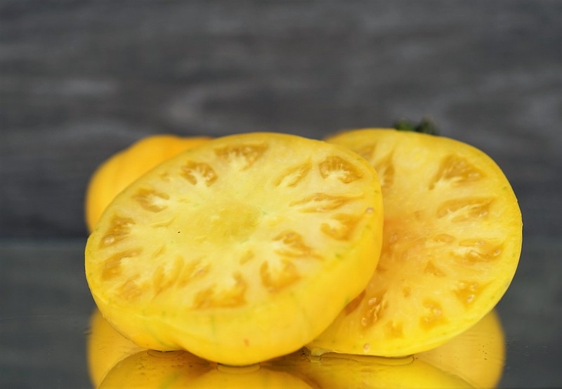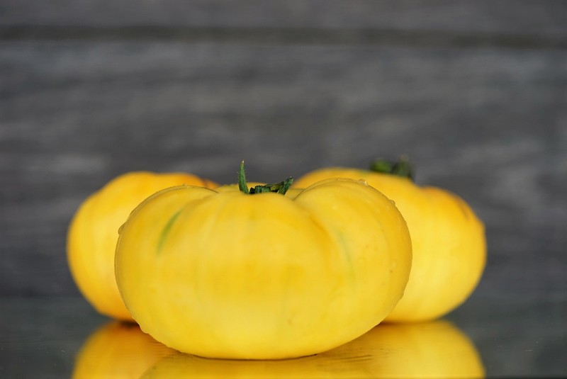 Штамб, , в открытом грунте 0,4-0,6 м в теплице до 1,0 м. Среднеспелый. Помидоры плоскокруглые, с пышными плечиками. Плоды бледно-золотистые, массой 100-200 грамм. В конце сезона может присутствовать лёгкий красный румянец или шапочка. Плоды многокамерные, малосемянные. Вкус насыщенный, с лёгкой кислинкой. Назначение салатное. Подходит для экзотических разноцветных соусов.