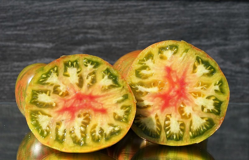 Штамб, среднеспелый. Высота 0,8в открытом грунте, до 1,5 м в теплице. Помидоры плоскокруглой формы, очень нарядные полосатые. На сочно-зеленом фоне красные и розовые полоски. Мякоть многоцветная. Масса в 150-250 грамм, до 300 грамм. Назначение салатное. Очень красиво выглядит в нарезке.