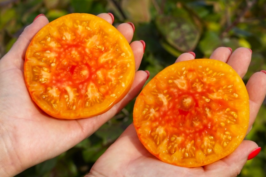Индет, до 1,5-1,7 м. Среднеспелый. Форма плоскоокруглая. Масса  200-300 грамм. Цвет: желтый с красными румянами и полосами. Мякоть плотная, желто-оранжевая с розовым центром и разводами. Хорошо сбалансированный вкус, с насыщенным томатным ароматом.