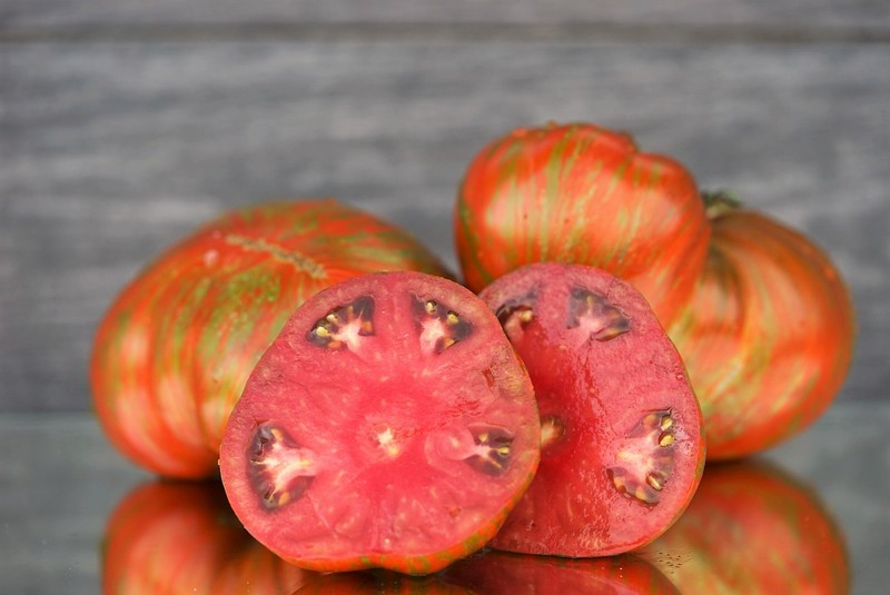 Детерминант, штамб. Высота до 1,2 м. Среднеспелый. Помидоры широко-сердцевидной формы. Масса 200-300 гр., до 400 грамм. Кожица с полосками темно-красных, коричневых и оливковых оттенков. Мякоть плотная, бордово-коричневая. Помидоры мясистые, малосемянные. Вкус сладкий с пряными нотами и кислинкой, свойственной черноплодным томатам.