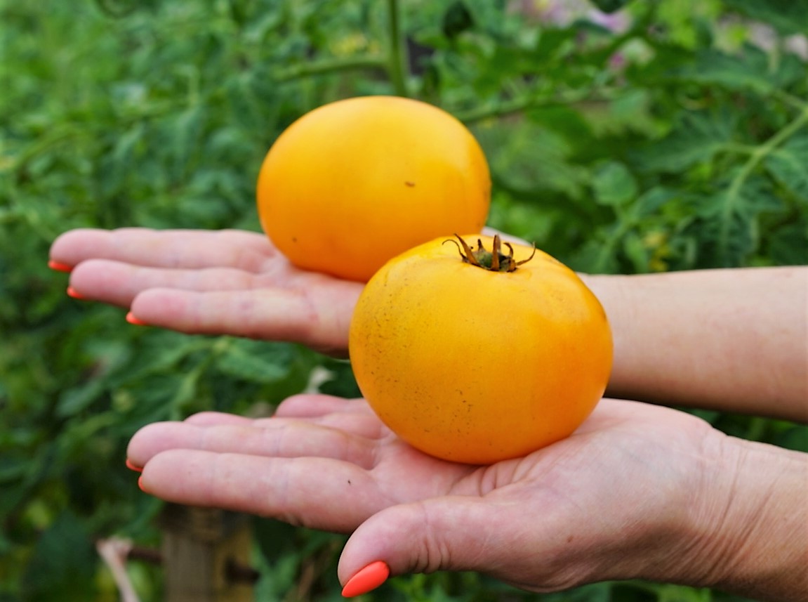 Детерминант. Среднеспелый. Высота до 0,7 м. Лист картофельный морщинистый. Плоды плоскоокруглой формы. Масса 90-250 грамм. Цвет золотисто-оранжевый. Зависит от количества солнца и тепла — чем больше, тем насыщеннее будет цвет. Мякоть плотная, упругая. Шкурка тонкая, но не склонна к растрескиванию. Сбалансированный вкус с цитрусовыми нотами.