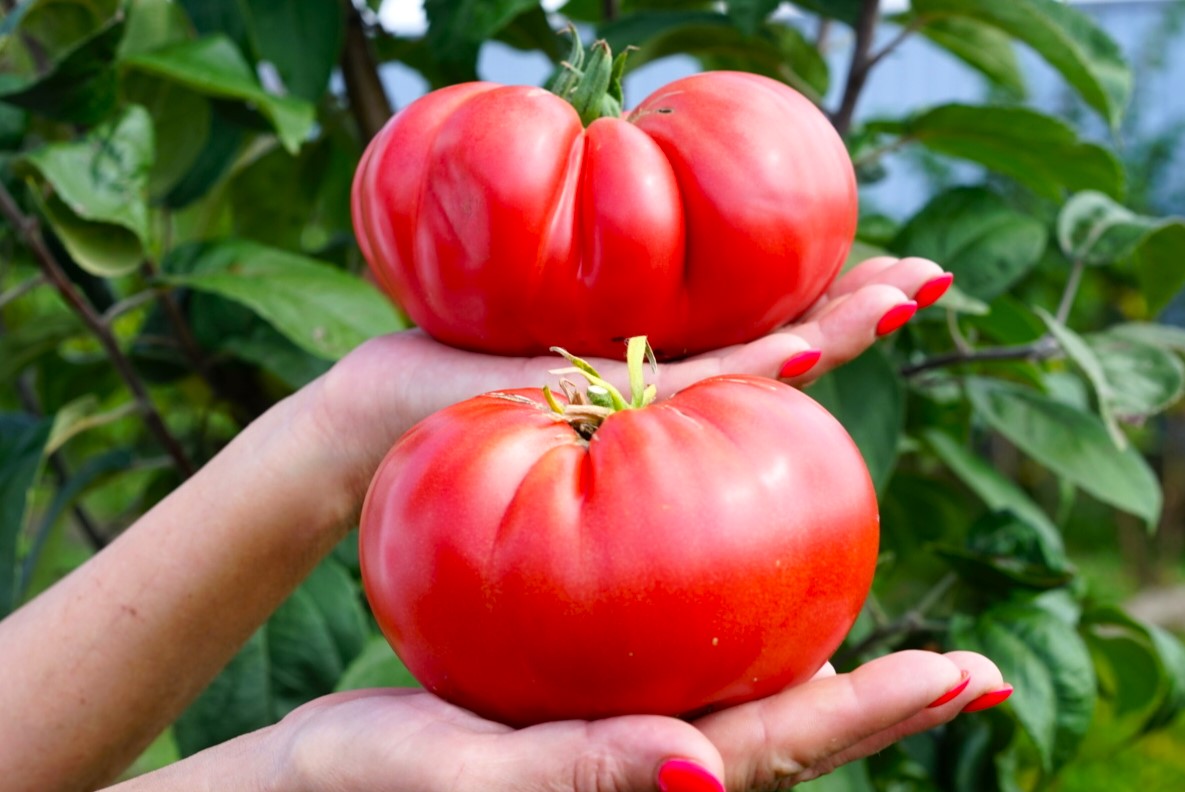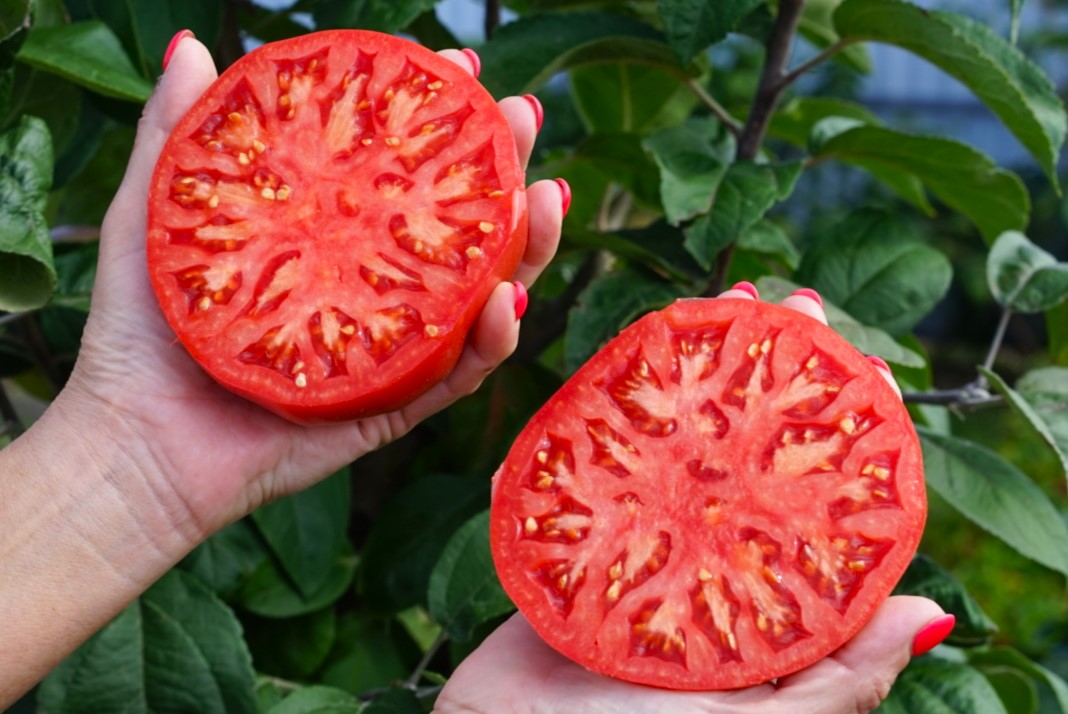 Индет, до 2,0 м. Среднеспелый. Форма плоскоокруглая с пышными плечиками. Масса 600-800 грамм, отдельные плоды могут достигать веса в 1000 грамм. Цвет красный. Мякоть сочная, сахарная, мясистая. Вкус сладкий.
