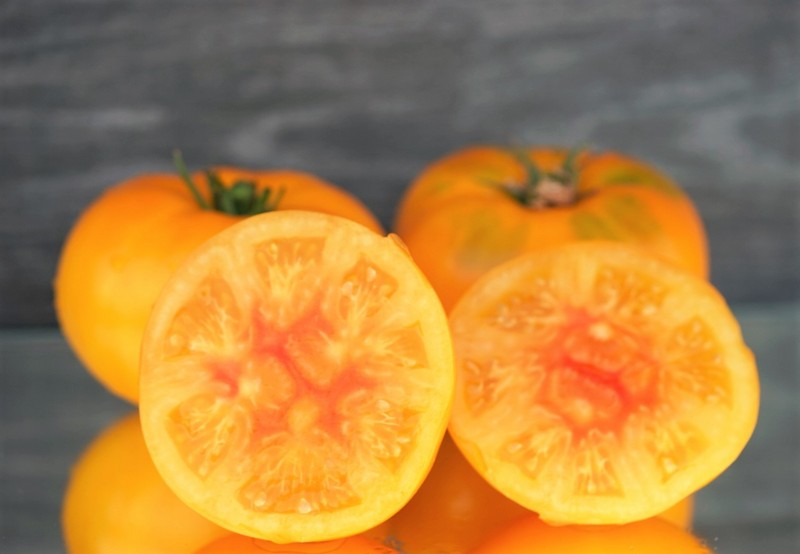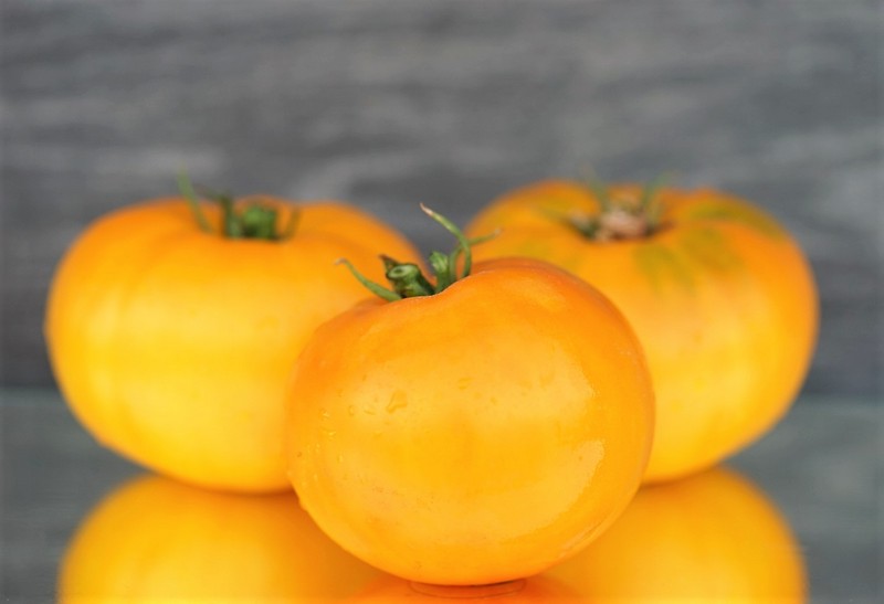 Ранний индетерминантный сорт. В теплице до двух метров. Строение куста крепкое. Можно вести в два стебля. Но в теплице место ему не досталось. Рос в открытом грунте. В открытом грунте до 160 см. Помидоры янтарного цвета, массой 200-600 грамм. Форма — плоскокруглые, с пышными плечиками. Мякоть мясистая с небольшими семянными камерами. Отличный сладкий вкус. Замечательный салатный сорт. Подходит для приготовления соков и соусов.