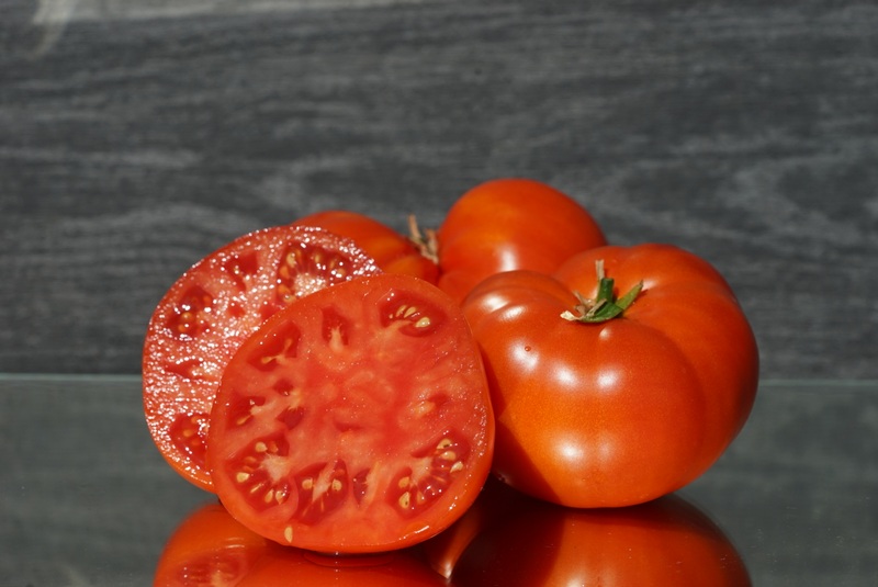 Среднеспелый индетерминантный сорт. Для теплиц. Высокорослый, мощный куст. Можно вести в 1-2 стебля. Требователен к питанию и солнечному месту. Помидоры ярко-Красные, плоскокруглые, 300-500 грамм и до 1000 грамм. В кистях лучше оставлять 3-4 завязи. Семянные камеры небольшие с малым количеством мелких семян. Мякоть — помидорное мясо. Насыщенный яркий вкус. Отличный салатный сорт, подходит для густых соусов.