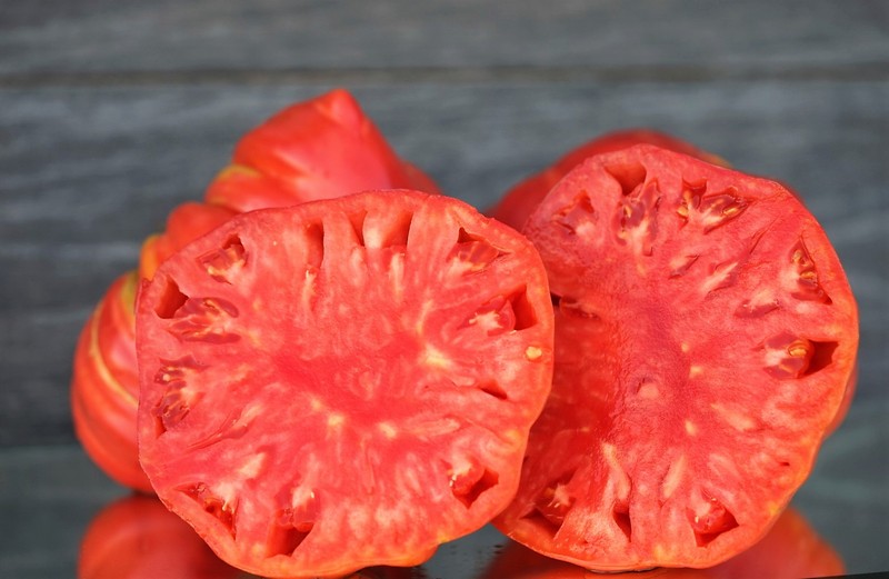 Индет, 1,8 м. Среднеспелый. Форма помидоров плоскокруглая с присобранными плечиками. Масса 300-600 грамм, до 1000 грамм. Цвет жемчужно-алый-розовый. Мясистые, семян практически нет, семянные камеры маленькие. Вкус сладкий с сильным томатным ароматом.