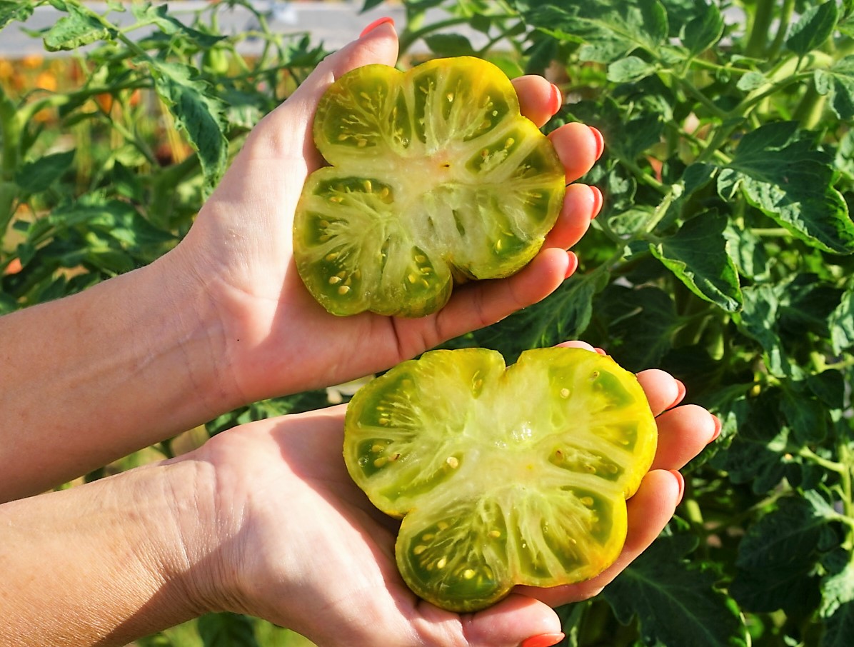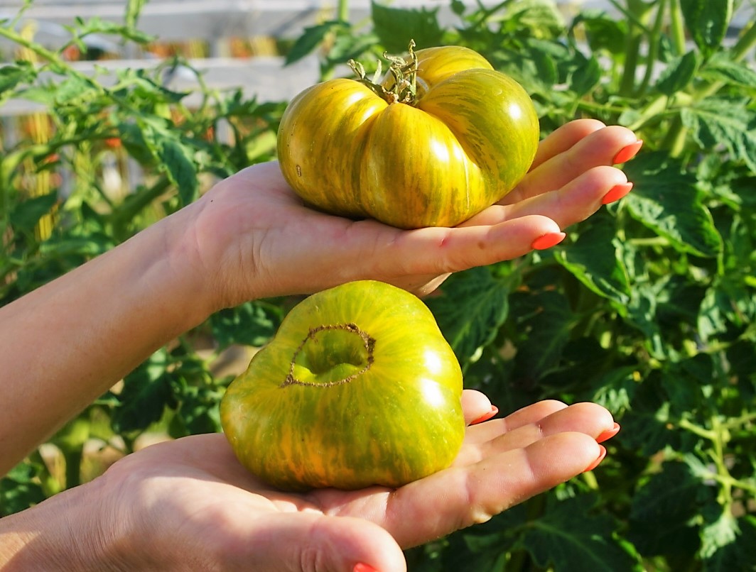Индет. Среднеспелый. Форма плоскоокруглая, пышная, и округлая. Масса 150-250 грамм. Цвет: кожица цвета охры с темно-зелеными полосками, мякоть изумрудно-зеленого цвета, упругая, мясистая.  Вкус насыщенный, ароматный.