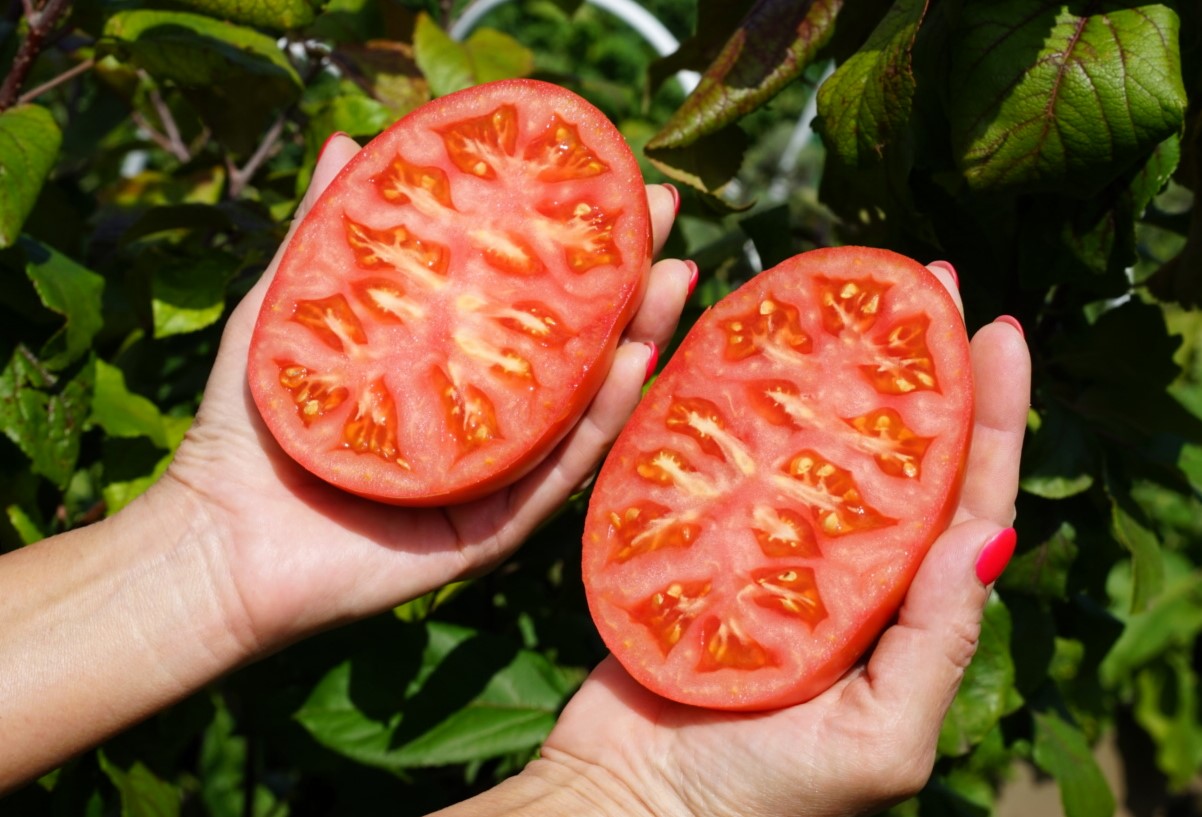 Индет, до 2,0 м.  Среднеспелый. Форма округлая. Масса 300-350 грамм, отдельные плоды более 500 грамм. Цвет тёмно-красный. Мякоть мясистая, сочная. Вкус очень сладкий.