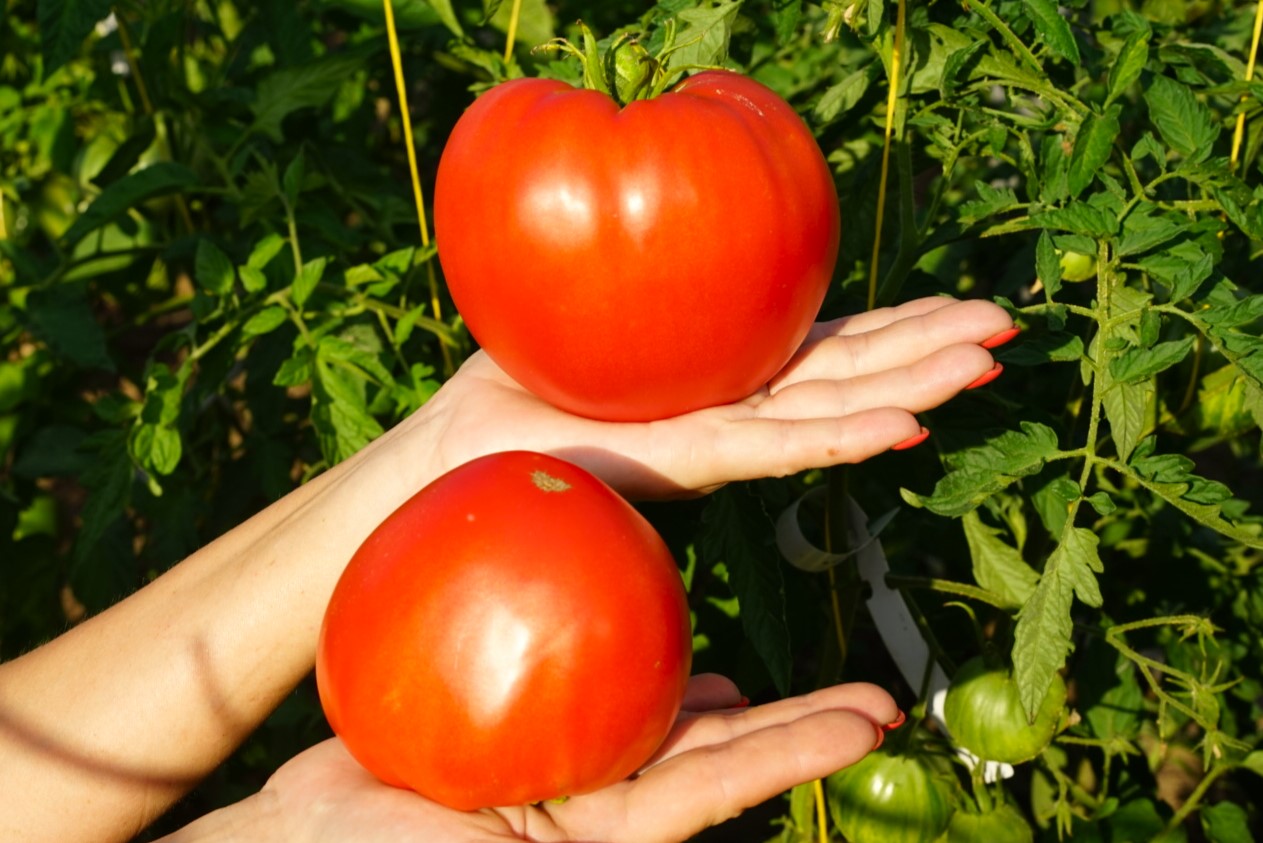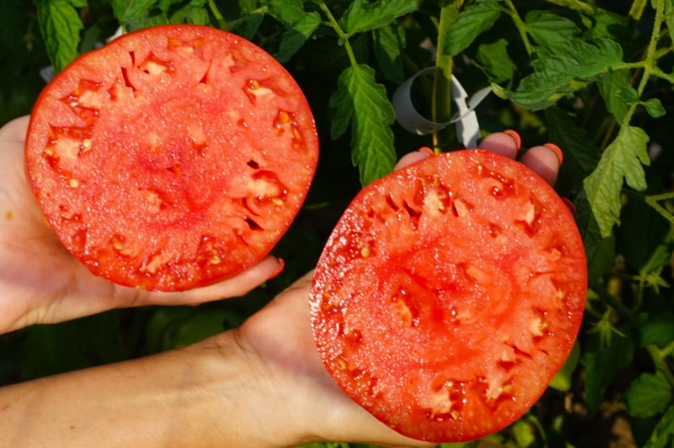 Индет, до 2,0 м. Среднеспелый. Помидоры сердцевидные, крупные. Масса 400-500 грамм, до 600 грамм. Цвет красный. Мякоть мясистая, сахаристая. Вкус насыщенный, сладкий, без кислоты.