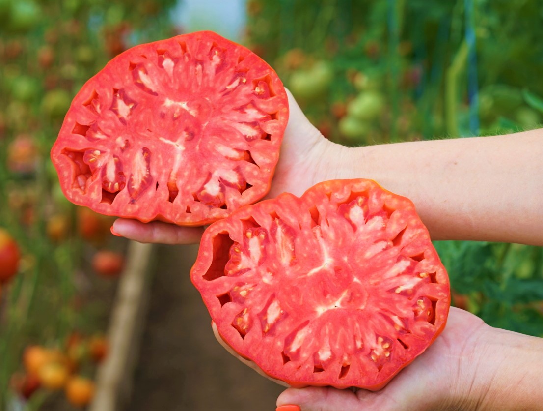 Среднеспелый индетерминантный сорт. Для теплиц. Высокорослый, до 250 см, крупноплодный. Помидоры округлые с ребристыми плечиками. Ярко-красные. Масса 400-500 грамм и более, до 1200 грамм. Сплошное помидорное мясо, насыщенный сладкий вкус без тени кислоты. Отличный сорт для салатов, густых соусов.