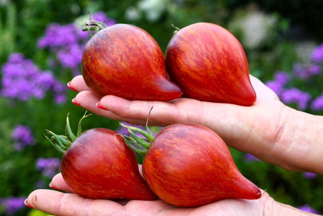 Индет, 1,8-2,0 м. Среднеспелый. Плоды сердцевидно-спиральные, с длинными острыми носами. Масса 100-300 грамм. Цвет розовый, переходящий в огненно-алый с полосками и мазками анто. Мякоть сладкая, плотная, сочная с малым количеством семян.