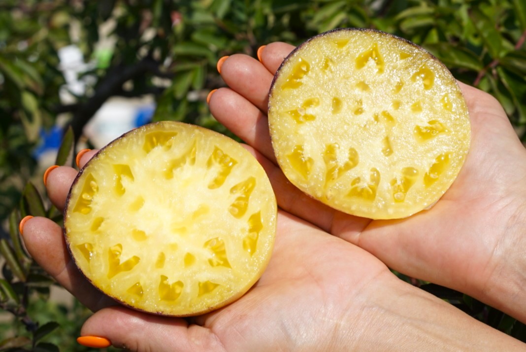 Индет. Среднеспелый. Куст крепкий, можно вести в 1-3 стебля. Листва обычная. В кистях до 5 завязей. Помидоры плоскоокруглой формы. Масса 200-350 грамм, до 400 грамм. Цвет  желтовато-кремовый с чернильными плечиками и штрихами и пятнами. Мякоть мясистая, нежного кремового цвета. Вкус сладкий и без кислинки. Ароматный и нежный десертный сорт.