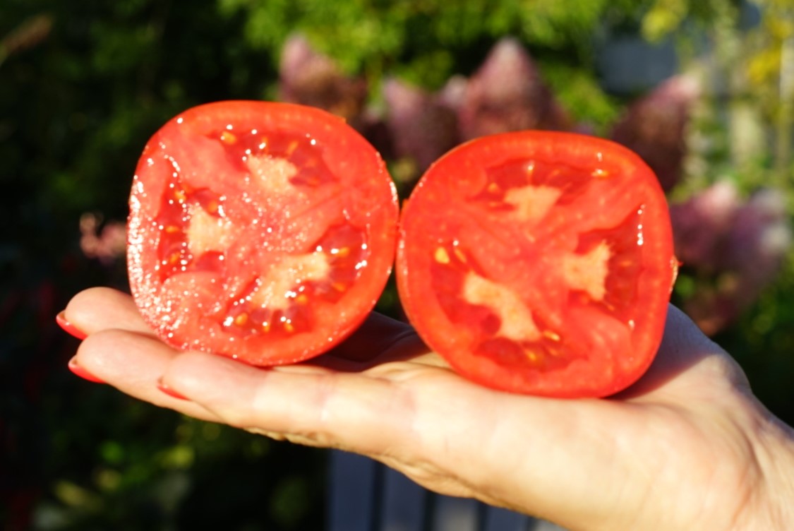 Индет, до 1,8 м. Среднеспелый. Форма перцевидная. Масса 150-250 грамм. Цвет красный. Плоды гладкие, глянцевые, мясистые, с высоким процентом сухого вещества. Мякоть с маленькими семенными камерами, почти без семян. Вкус сладкий, насыщенный.