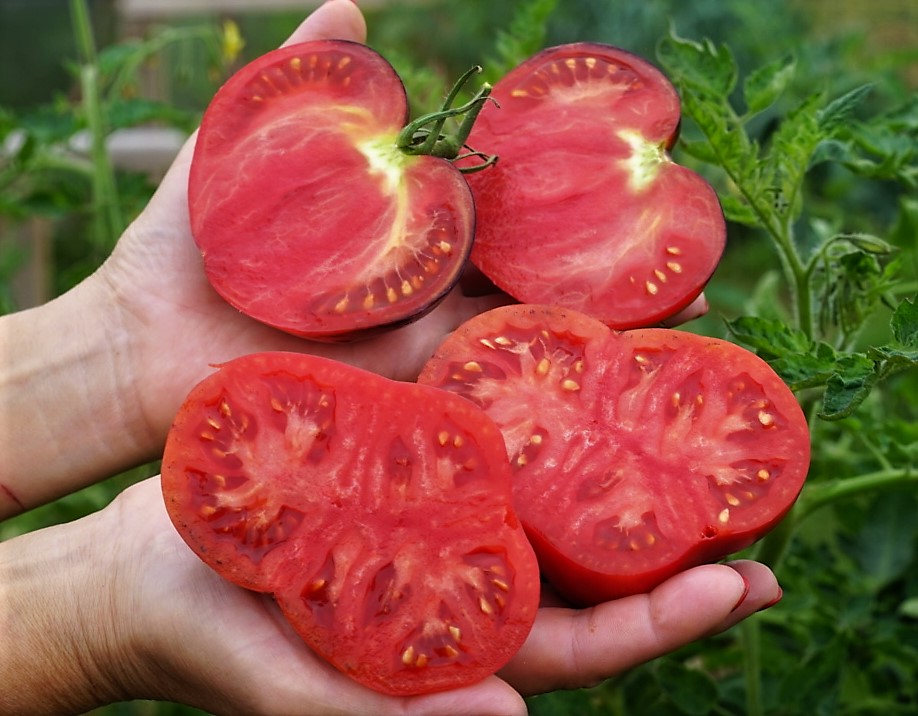 Помидоры сердцевидной формы. Цвет: тёмно-фиолетовые плечи, сиренево-красная макушка. Мякоть малиново-розовая. Масса до 300 грамм, в основном 150-200 грамм.  Вкус сладкий, карамельный. Один из самых красивых и надёжных сортов в нашей коллекции.