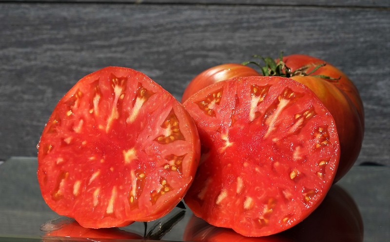 Индет, до 2,0 м. Среднеспелый. Помидоры плоскоокруглые, с небольшой ребристостью. Цвет Красные. Масса до 300-600 грамм и более, до 1000 грамм. Насыщенный, яркий сбалансированный вкус с лёгкой кислинкой. Мякоть мясистая, малосемянная, сахарная. Сорт преимущественно салатного назначения, подходит для густого соуса, пасты.