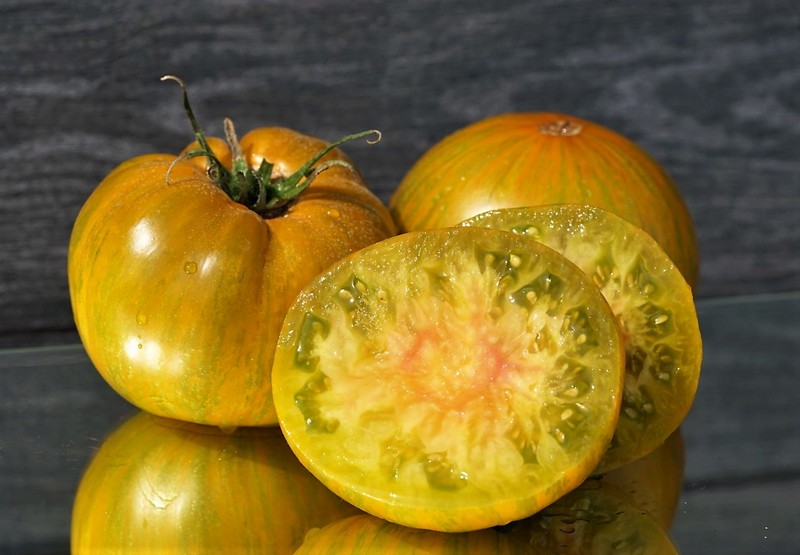 Индет, до 2,0 м. Среднеспелый.  Плоды плоскоокруглые. Окраска полосатая. Зелено-желтые снаружи. Масса от 200 до 300 г. Мякоть многоцветная. Вкус сладкий с нежной кислинкой. Плодоношение растянутое, до заморозков. Сорт устойчив к основным заболеваниям томатов.