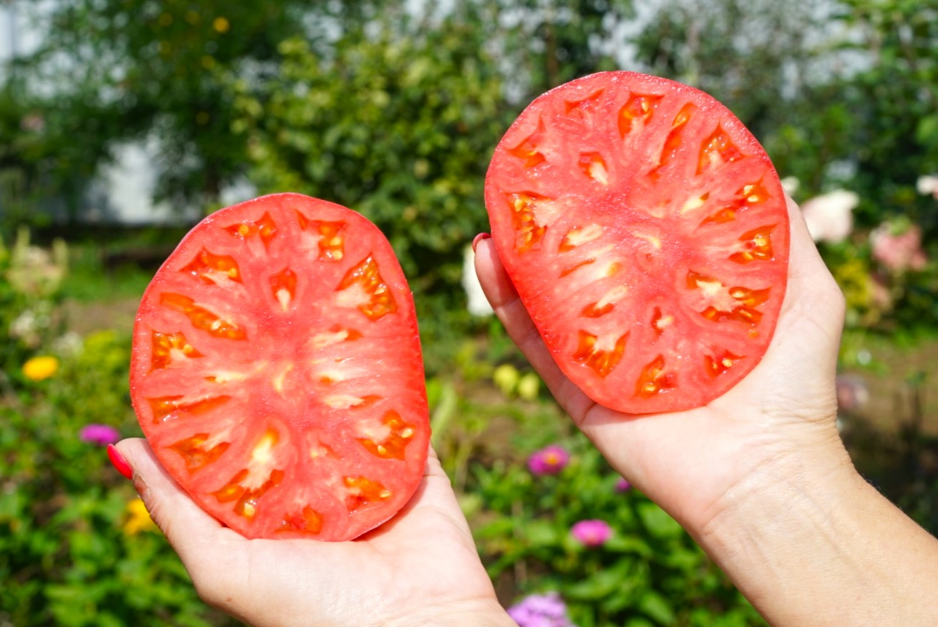 Индет, до 2,0 м. Среднеспелый. Форма плоскоокруглая. Масса 400-700 грамм и более, до 1000 грамм. Цвет розовый. Мякоть мясистая, «сахарная», сочная. Вкус сладкий, мякоть очень ароматная, кожица тонкая.