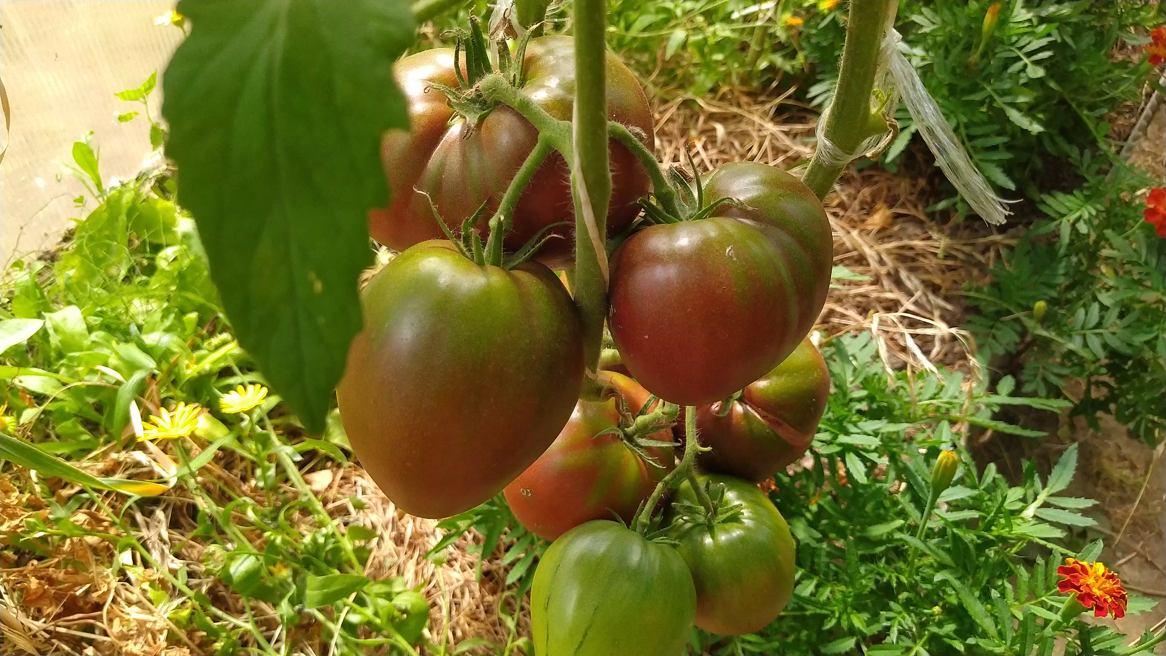 Темный цвет томатов обусловлен высоким содержанием в них антоциана — природного антиоксиданта, регулярное употребление которого крайне благоприятно влияет на здоровье сердца и сосудов, а также улучшают работу печени и кишечника.