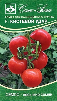 Томат Кистевой Удар F1 - ранний, индетерминантный гибрид кистевого типа. От всходов до созревания 95–105 дней. Растение компактное. Первая кисть с 6–7 плодами закладывается над 9–11 листом. Помидоры округлые, насыщенной красной окраски без зеленого пятна, гладкие, плотные, массой 130–150 г. Вкус, товарность и транспортабельность хорошие. Устойчив к вирусу бронзовости томата (TSWV), вирусу томатной мозаики (TоMV), вирусу желтого скручивания листьев (TYLCV), фузариозу (Fol 1–2) и к галловым нематодам (Mi, Ma). Уборка кистями или отдельными плодами. Вкусовые и товарные качества сохраняются в течение 20–30 дней после уборки. Используется для потребления в свежем виде. Рекомендуется для выращивания во всех типах теплиц. Густота посадки 2,5–3 раст./м2, схема посадки 70х40 см. Урожайность свыше 27 кг/м2.