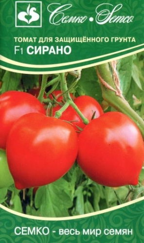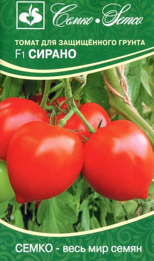 Томат Сирано F1 - ранний, индетерминантный гибрид. От всходов до созревания 95-105 дней. Растения вегетативного типа, среднеоблиственные, листья крупные светло-зелёные. Кисти простые с 5-6 плодами. Помидоры тёмно-красные, округлые с заострённой вершиной «носиком», массой 150-200 г, очень плотные, лёжкие. Отличается дружностью плодоношения, выравненностью плодов по форме и массе в кисти и на всём растении. Гибрид отлично завязывает плоды в условиях повышенных температур и недостатка влаги в почве и воздухе. Вкус отличный, содержание сухого вещества 5,7-5,8 %, сахара 3,5-3,8 %, аскорбиновой кислоты до 30 мг%. Томат Сирано F1 отличается устойчивостью к вирусу томатной мозаики (ToMV), вертициллёзному (Va, Vd) и фузариозному (Fol 1-2) увяданию, кладоспориозу (Ff), и чёрной бактериальной пятнистости (Pst). Плотность посадки 2,5-3 раст./м2, формировка – в один стебель. В течение месяца созревает более 60% плодов. Урожайность свыше 20 кг/м2.