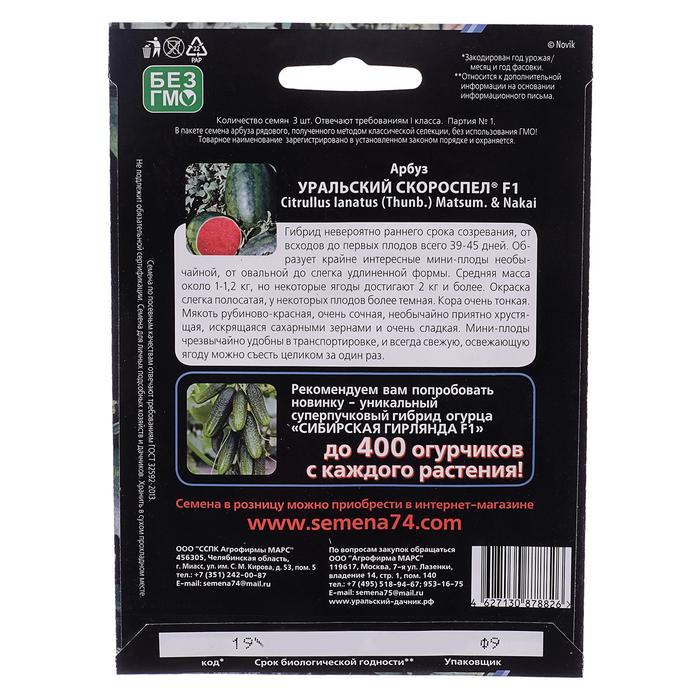 Гибрид невероятно раннего срока созревания, от всходов до первых плодов всего 39-45 дней. Образует крайне интересные мини-плоды, необычайной от овальной, до слегка удлинённой формы. Средняя масса около 1-1,2 кг, но некоторые ягоды достигают 2-х и более кг. Окраска слегка полосатая, у некоторых плодов более тёмная. Кора очень тонкая. Мякоть рубиново-красная, очень сочная, необычайно приятно хрустящая, искрящаяся сахарными зёрнами и очень сладкая. Мини плоды чрезвычайно удобны в транспортировке и всегда свежую, освежающую ягоду можно скушать целиком за один раз.
