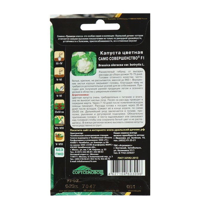 Агротехника: цветная капуста очень требовательна к питанию и влаге, не выносит кислых почв. Посев на рассаду проводят в середине марта. Через 7-10 дней после появления всходов сеянцы пикируют. Рассада готова к посадке через 35-40 дней после всходов. Сажают ее в конце апреля, по схеме 35х50 см. Дальнейший уход заключается в поливе, прополке, рыхлении и регулярной подкормке. Обязательно притенение головок: 2 листа надламывают или связывают над головкой (чтобы она сохранила белый цвет и не распадалась). В южных регионах можно высевать семена капусты непосредственно в грунт.