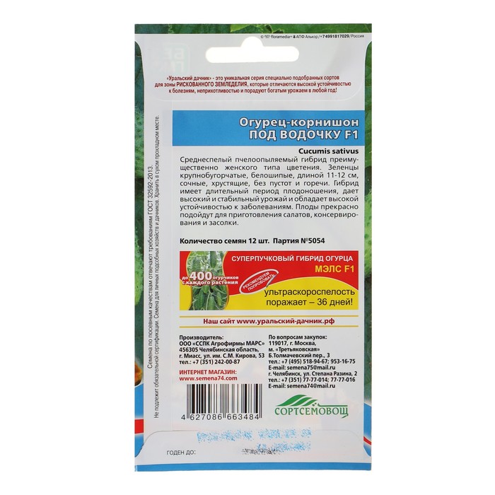 Среднеспелый пчелоопыляемый гибрид преимущественно женского типа цветения. Зеленцы крупнобугорчатые, черношипые, массой 90-100 г, длиной 11-12 см, сочные, хрустящие, без пустот и горечи. Гибрид имеет длительный период плодоношения, дает высокий и стабильный урожай и обладает высокой устойчивостью к заболеваниям.