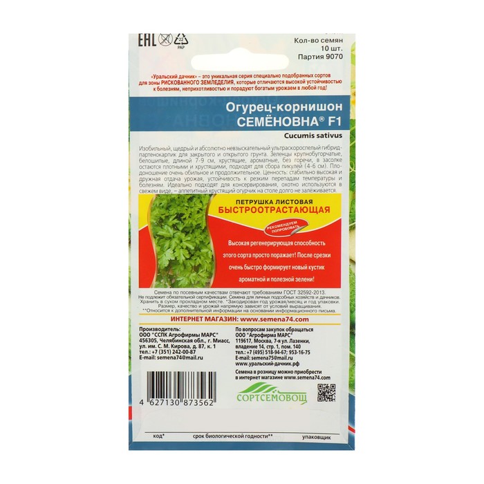 Скороспелый, самоопыляемый, пучковый гибрид для закрытого и открытого грунта. Зеленцы крупнобугорчатые, белошипые, длиной 7-9 см, хрустящие, ароматные, без горечи, в засолке остаются плотными и хрустящими, подходят для сбора пикулей (4-6 см).