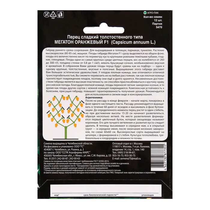 Посев на рассаду в конце февраля – начале марта, пикировка в фазе одного настоящего листа. Рассаду рекомендуется выращивать в течение 60 дней от всходов и высаживать в фазе бутонизации. До определенного момента перец растет в один стебель, но при достижении высоты 15-20 см начинает разветвляться, образуя несколько ветвей. На месте разветвления формируется первый цветочный бутон, который овощеводы называют коронным. Его для лучшего ветвления и развития куста следует удалить. В теплицу высаживают в середине мая, а в открытый грунт – в середине июня, после окончания весенних заморозков, по схеме 60х60 см. Высокорослые сорта выращивают на шпалере, с формировкой в 2 стебля. Культура теплолюбива, требовательна к плодородию и влажности почвы.