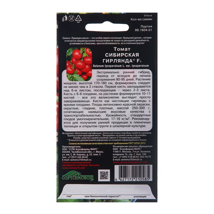 Экстремально ранний гибрид, период от всходов до начала созревания 90-95 дней. Растение мощное, высотой 170-180 см, формировать следует не менее чем в 2 ствола. Первая кисть закладывается над 6-м листом, последующие через 2-3 листа. Кисть с 6-8 плодами, на растении формируется 10-11 кистей всё это великолепие выглядит просто завораживающе, кисти как настоящие гирлянды с яркими плодами. Плоды интенсивно красной окраски, округлые, гладкие, плотные, массой 250-300г, сочетающие наивысшие вкусовые качества с транспортабельностью. Урожайность стандартных плодов умопомрачительная 17-19 кг/м².Рекомендуется для получения ранней продукции в плёночных теплицах и открытом грунте в шпалерной культуре.