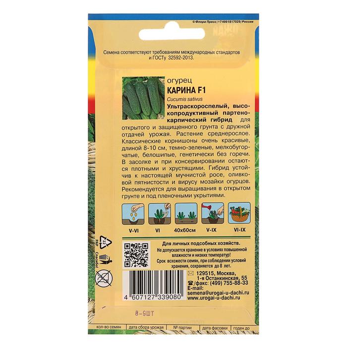 Ультраскороспелый, высокопродуктивный партенокарпический гибрид для открытого и защищенного грунта с дружной отдачей урожая. Растение среднерослое. Классические корнишоны очень красивые, длиной 8-10 см, темно-зеленые, мелкобугорчатые, белошипые, генетически без горечи. В засолке и при консервировании остаются плотными и хрустящими. Гибрид устойчив к настоящей мучнистой росе, оливковой пятнистости и вирусу мозайки огурцов. Рекомендуется для выращивания в открытом грунте и под пленочными укрытиями.