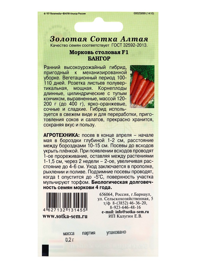 Семена Морковь "Бангор F1", раннеспелая, 0,2 г