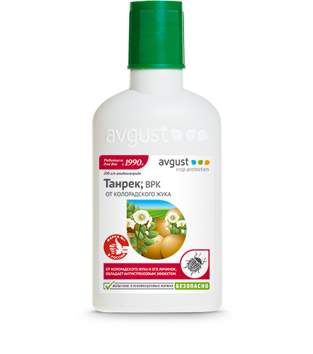 Avgust Танрек– инсектицид системного действия для уничтожения колорадского жука на картофеле на всех стадиях его развития. Препарат поражает нервную систему насекомых при попадании на них раствора или питании обработанным растением. Взрослые жуки и личинки утрачивают способность двигаться, они прекращают питаться, а через 2–3 суток погибают. Картофель после обработки становится несъедобным и для вредителей, прилетевших с соседних территорий. Благодаря повышенной стойкости препарата к смыванию дождевой водой защитный эффект сохраняется до 3 недель.• Обеспечивает надежную защиту от вредителей основных сельскохозяйственных культур в различных условиях их выращивания.
