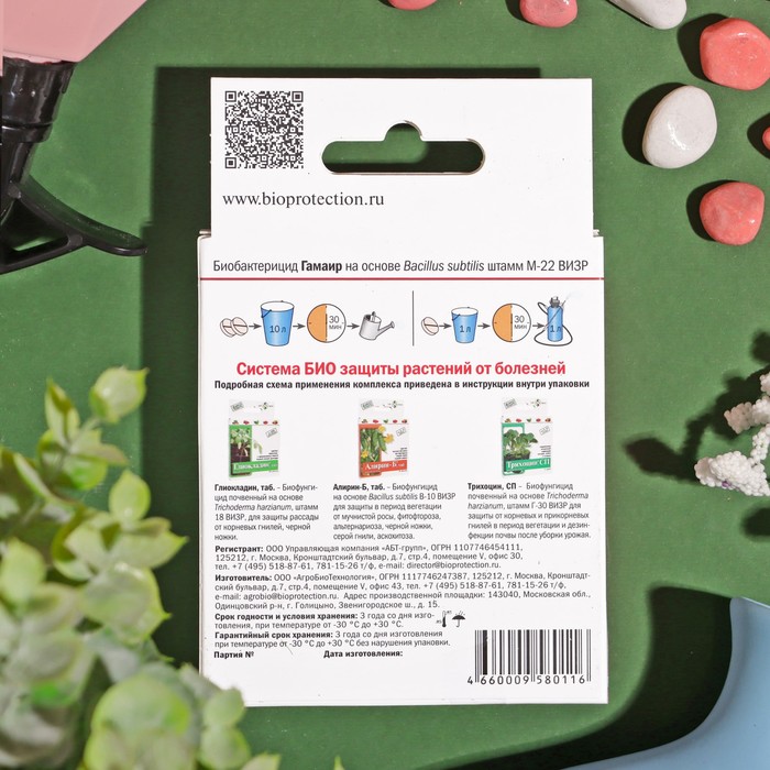 Гамаир, таб - биологический бактерицид на основе природной бактерии Bacillus subtilis М – 22 ВИЗР, предотвращающий пятнистости на листьях, бактериальные гнили, паршу, монилиоз, бактериальный рак, сосудистый и слизистый бактериозы.