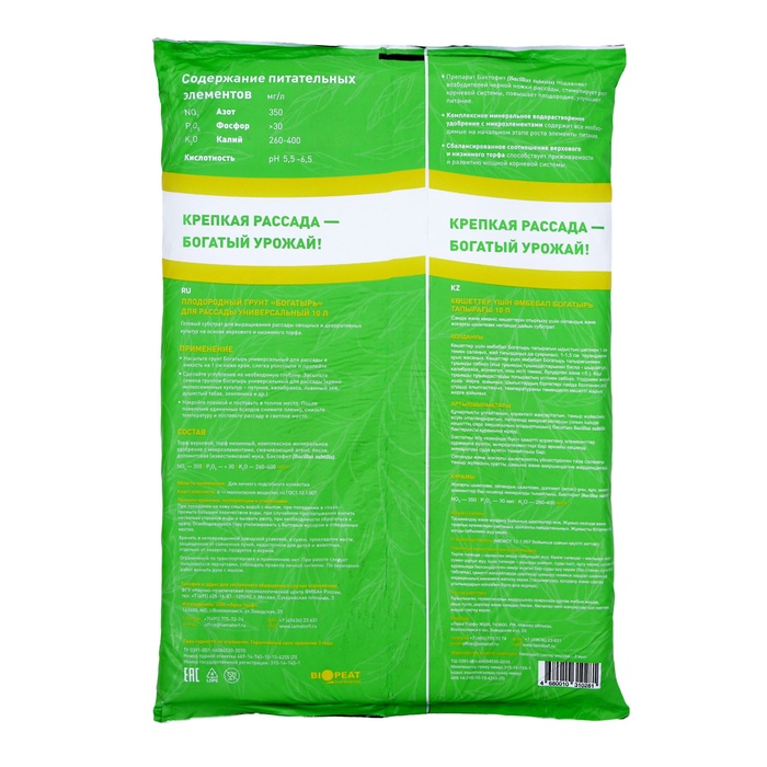 Готовый субстрат для выращивания рассады овощных и декоративных культур на основе верхового и низинного торфа. Содержит бактерии Bacillus subtilis, которые подавляют патогенные микроорганизмы (в том числе возбудителей черной ножки рассады), стимулируют рост корневой системы, улучшают питание, повышают плодородие. Содержит смачивающий агент благодаря которому грунт быстрее напитывается влагой. Первый Биогрунт, который полностью защищен от бактерий и заболеваний.быстрые всходымощный ростоптимальные водно-воздушные свойствапитание на весь период ростаПРИМЕНЕНИЕ: Декабрь – Май СОСТАВ: Торф верховой, торф низинный, песок, известняковая (доломитовая мука), комплексное минеральное удобрение, Bacillus subtilis, смачивающий агент, гумат. Содержание макроэлементов: N – 300, P – 30, K – 400 мг/л Содержание микроэлементов: S Mg Ca B Fe Zn Mo Cu Mn pH 5,5-6,5