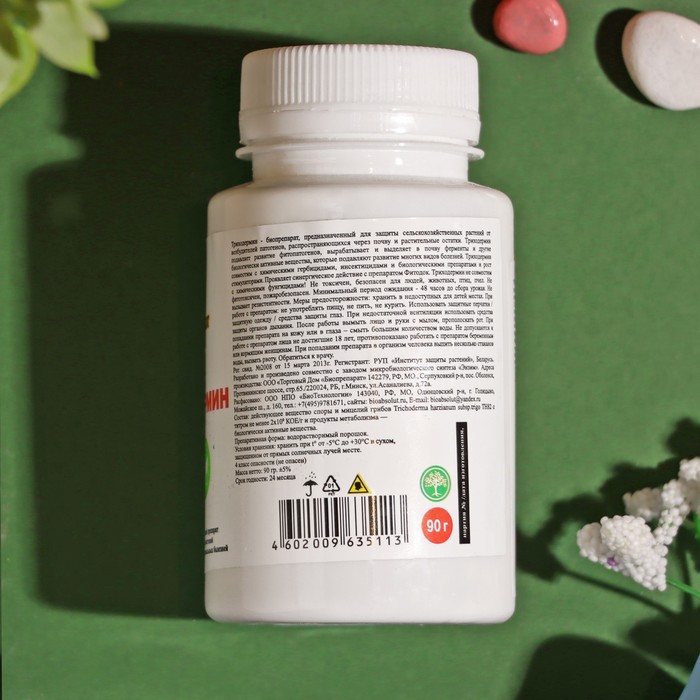 Высокоэффективный биологический препарат для борьбы с широким спектром возбудителей грибных и бактериальных заболеваний растений на основе спор и мицелия грибов Trichoderma harzianum subsp. trigo. Подавляет развитие фитопатогенов прямым паразитированием, конкуренцией за субстрат, выделением ферментов, антибиотиков (глиотоксин, виридин, триходермин) и других биологически активных веществ. Подавляет патогенных возбудителей, распространяющихся через почву и растительные остатки.